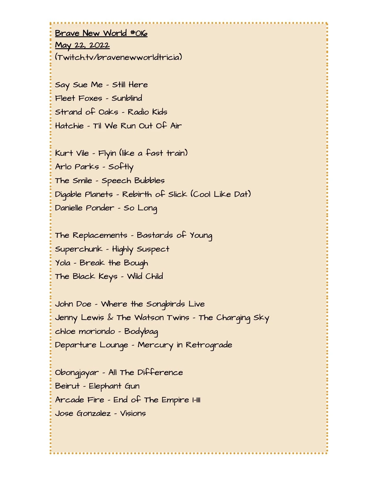 Below is the playlist for the May 22 edition of Brave New World. I stopped creating the links because although cool, it was quite time-consuming and I figure you can all look up the songs you’re interested in on your own preferred music service.