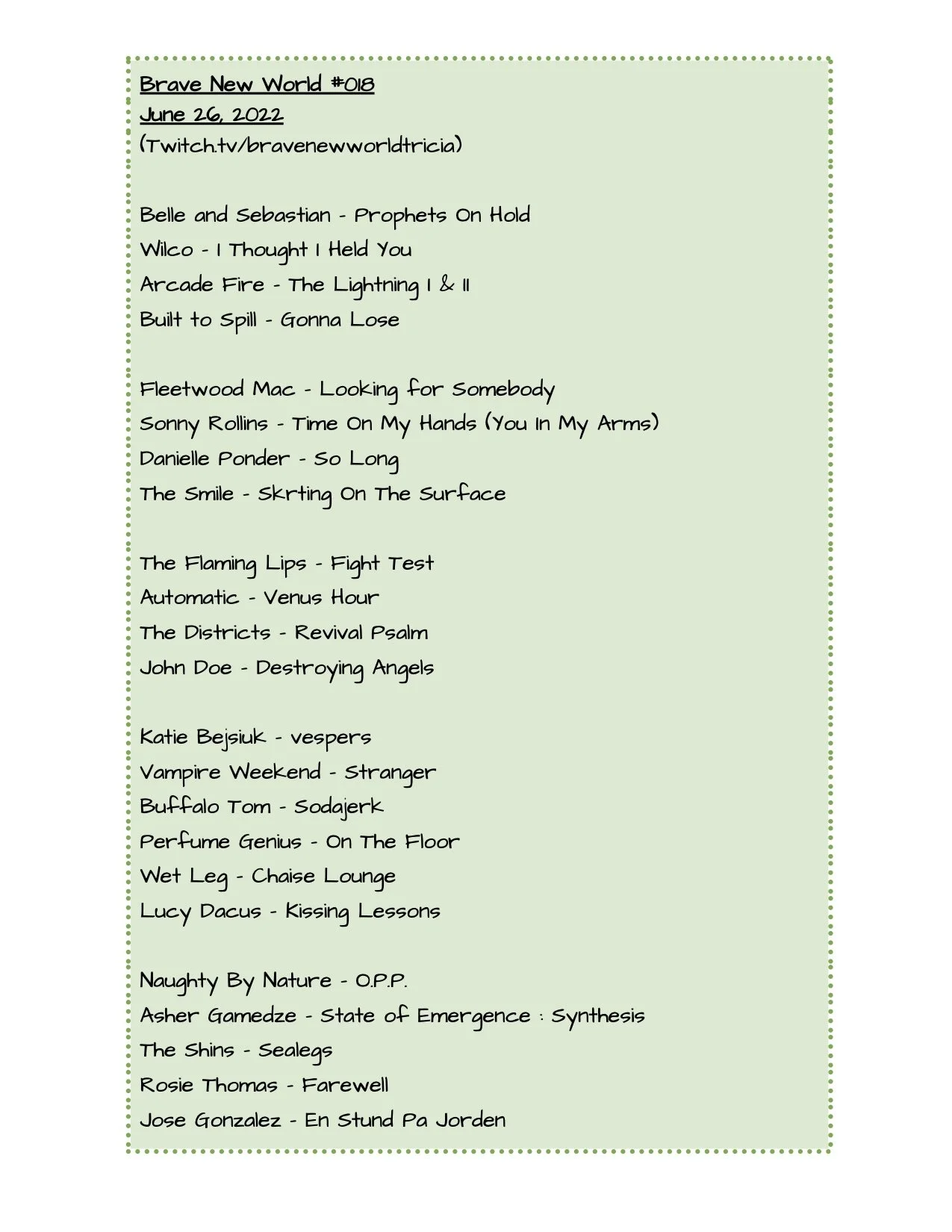 Below is the playlist for the June 26 edition of Brave New World, featuring new Belle & Sebastian, Arcade Fire, The Districts and John Doe alongside some vintage faves like The Flaming Lips, Naughty by Nature and Wilco.